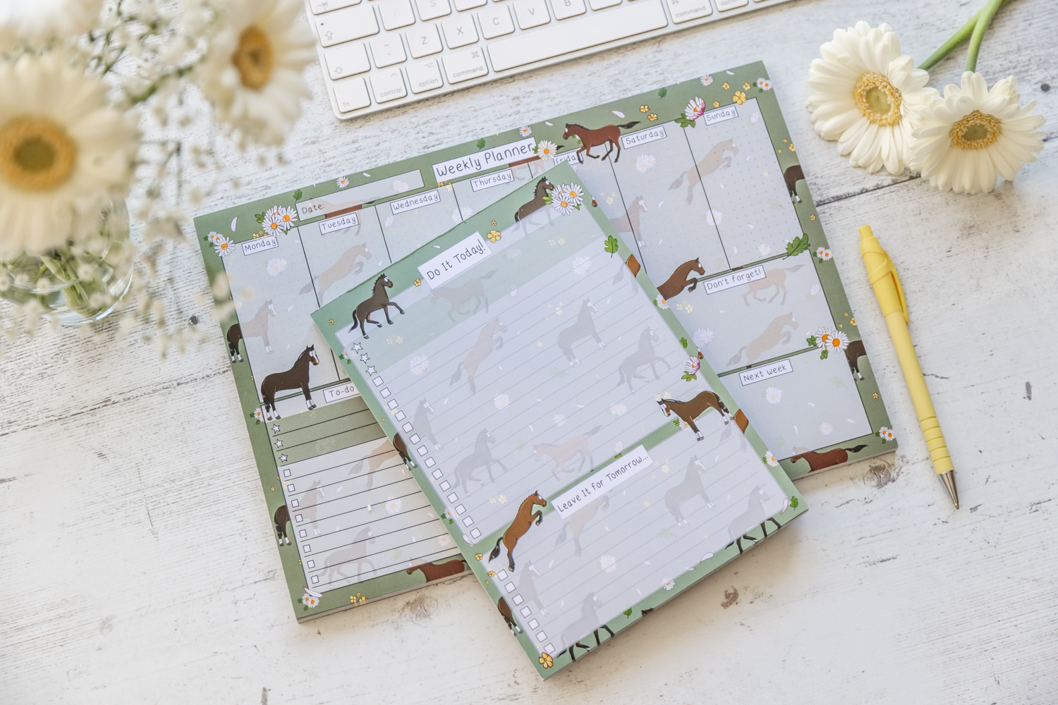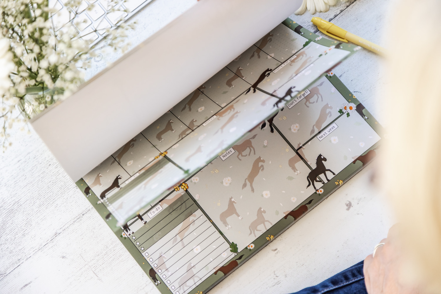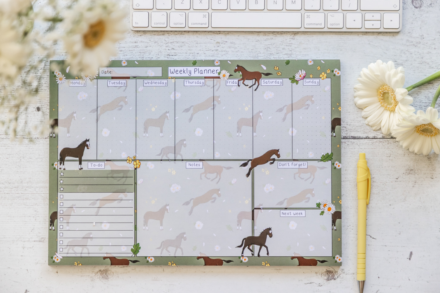 Stay organised with our Bay Horse Weekly Desk Planner, featuring Bay Horse illustrations surrounded by daisies.